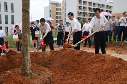 (圖三)彭定邦常務(wù)副市長等領(lǐng)導(dǎo)為我校“企業(yè)冠名林”植樹培土