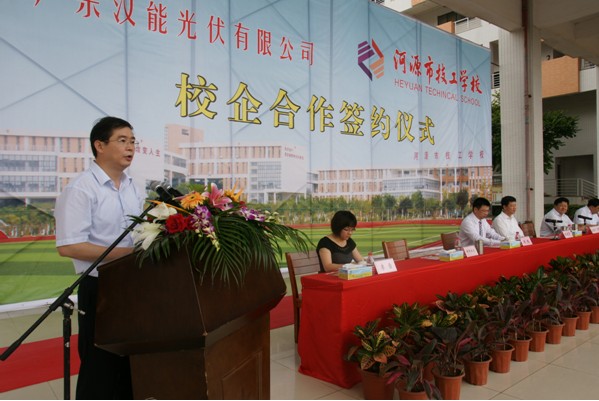 市委書記、市人大常務(wù)會主任陳建華,市委常委、副市長楊耀初,廣東漢能光伏有限公司董事長劉明,市人力資源和社會保障局黨組成員、市技工學(xué)校校長歐陽仕文共同為校企合作牌匾揭牌。