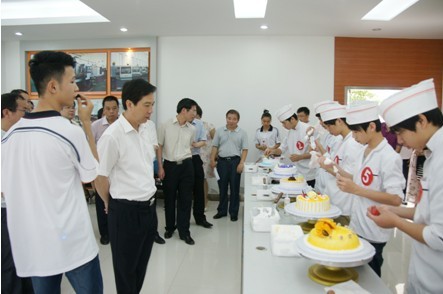(圖四)常務(wù)副市長(zhǎng)彭定邦同志一行正在觀看我校第六屆技能節(jié)“蛋糕裱花”項(xiàng)目比賽