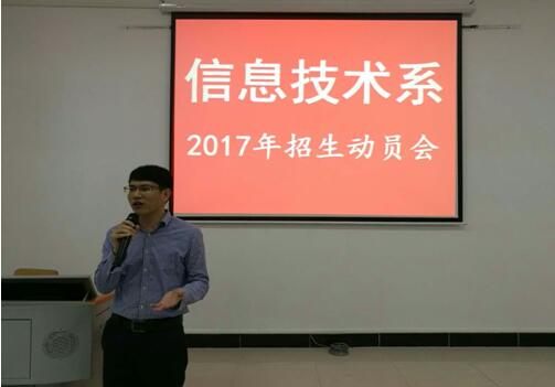 2017年4月5日晚,信息技術(shù)系在實訓(xùn)樓階梯教室召開2017年招生工作動員會。信息技術(shù)系朱少威主任主持會議并發(fā)表講話,信息技術(shù)系各班班主任以及招生積極分子參加了會議。